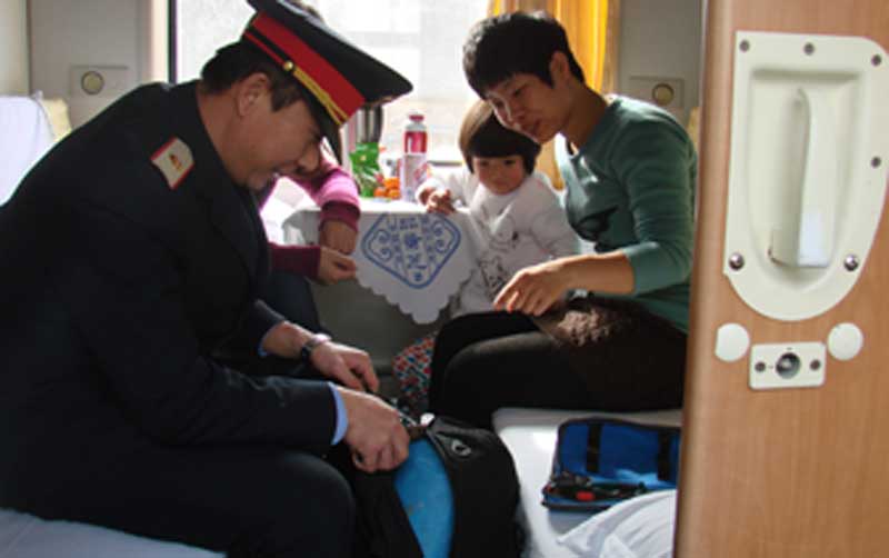 同时,列车上还配备了工具包,为旅客提供修包服务。图为列车乘务人员在帮助旅客修理损坏的箱包。中工网通讯员 侯帅 摄