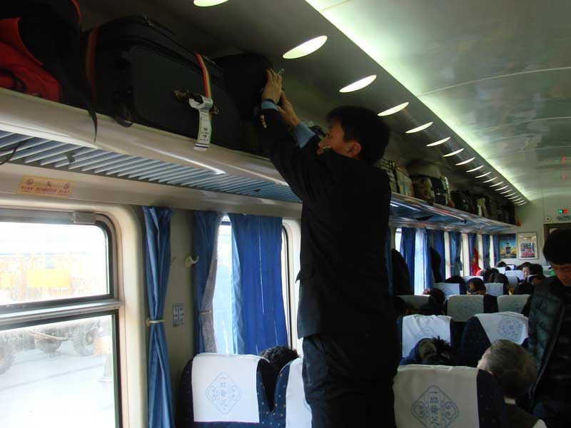 列车乘务人员在整理旅客的行李。中工网通讯员 侯帅 摄