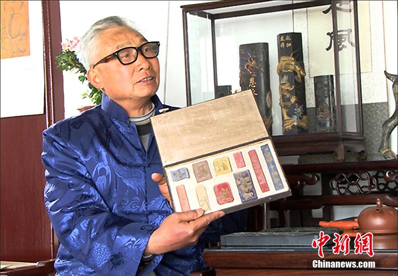 2月6日,苏州老人李师傅展出了自己收藏了40多年的明清各类墨石,其中不乏一些名人作品。经苏州书法协会的专家潘振元的初步估测,这些墨石的价值可能达数百万。据了解,李师傅是在上个世纪70年代,从一位晚晴当铺朝奉的后人手中购得。木匠出身的李师傅,对于墨石上的雕花技艺极为喜欢,但这些年来对于墨石的具体价值,自己却不甚了解。最初购买的时候,墨石多达1000余枚,后因保管不当等原因,如今仅留400余枚。日前,在一位友人的建议下,方才找到苏州书法协会的有关专家进行藏品鉴定。图为老人展示一套五子登科的墨石。陆兆里 摄