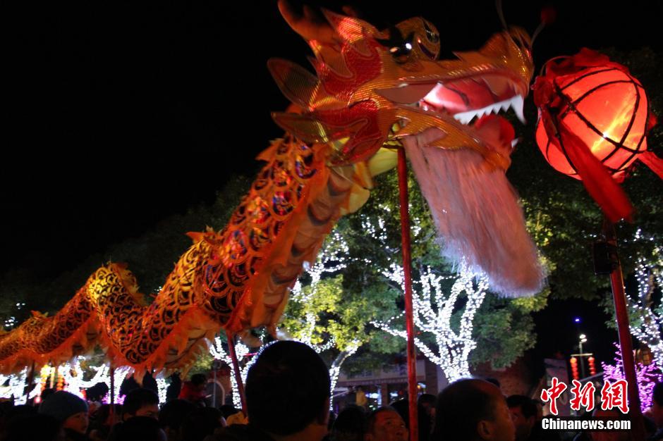 2月13日,在习惯把正月十四作为元宵节的浙江石浦渔港古城热闹非凡。这一天,几乎所有的古城居民都出门参与游街队伍。石浦“十四夜”闹元宵活动由当地群众的鱼灯队、马灯队、龙队进行踩街、巡游的表演形式组成,舞鱼灯滚龙灯跑马灯闹元宵展示了当地的浓厚“渔味”文化。图为游街队伍。中新社发 林波 摄
