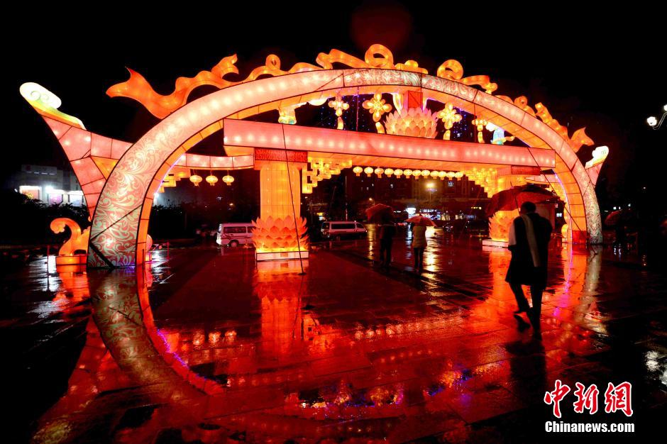 2月13日晚,中国传统元宵佳节临近,福州春雨绵绵,市民不畏寒冷冒雨观花灯。中新社发 王东明 摄