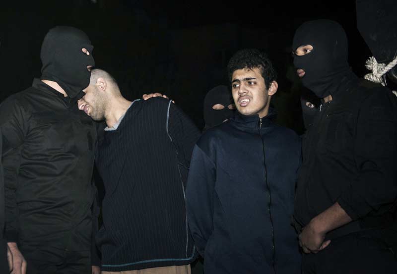 2014年荷赛奖一般新闻类单幅三等奖,摄影师Amir Pourmand当地时间2013年1月20日,伊朗德黑兰,Alireza Mafiha(左二)将头倚靠在一名安全部队官员的肩膀上,他将与Mohammad Ali Sarvari(右二)被处以绞刑。