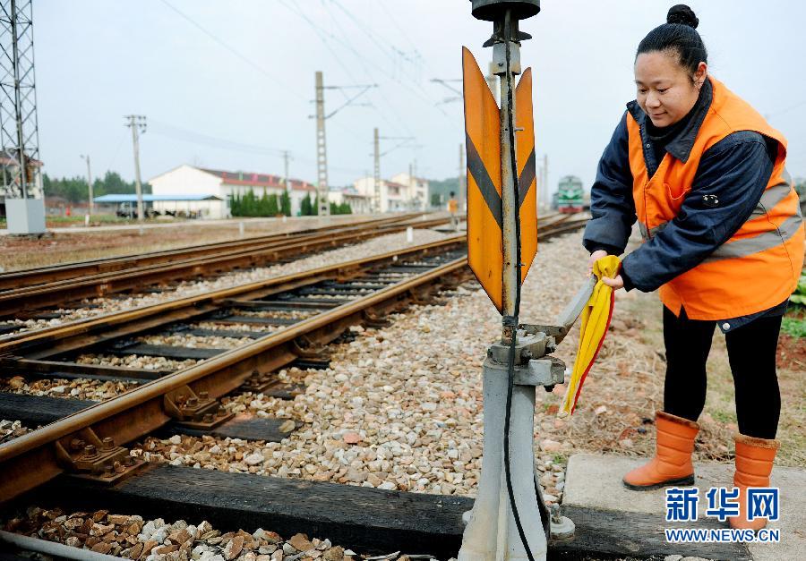 2月16日,扳道女工洪玫在扳动道岔。今年35岁的洪玫是江西南昌铁路局鹰潭机务段上饶折返点扳道女工,自21岁开始从事铁路扳道工作。扳道工是铁路上铁轨较多的地方用人工方式在一些道岔决定火车行进方向的工人,这一工种技术含量不高,工作看似简单,但责任重大,加上工作环境单调孤寂,洪玫已成为目前全段唯一也是最后一名女扳道工。随着越来越多的自动化电脑控制道岔系统投入使用,人工扳道将退出历史舞台,洪玫也被同事们称为“铁龙”最后的“女舵手”。新华社发(卓忠伟 摄)