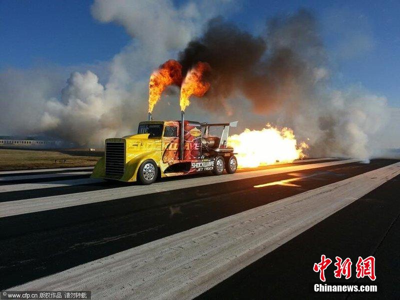 2014年2月18日消息(具体拍摄时间不详),加拿大工程师打造世界最快的飞机引擎动力卡车,车名为”冲击波“(Shockwave);它由3台飞机引擎组装而成,马力能达到惊人的36000匹,时速能达到400英里每小时。图片来源:CFP视觉中国