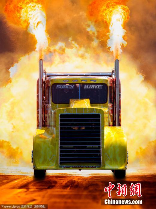 2014年2月18日消息(具体拍摄时间不详),加拿大工程师打造世界最快的飞机引擎动力卡车,车名为”冲击波“(Shockwave);它由3台飞机引擎组装而成,马力能达到惊人的36000匹,时速能达到400英里每小时。图片来源:CFP视觉中国
