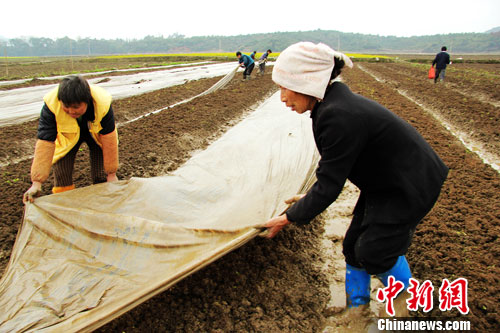 3月2日,湖南道县清塘镇楼田村的农民为刚撒下的种子覆盖农膜。当天是农历二月初二,二月二又叫“春耕节”、“农事节”、“春龙节”,是汉族民间传统节日。它表示春季来临,万物复苏,蛰龙开始活动,预示一年的农事活动即将开始。何红福 摄