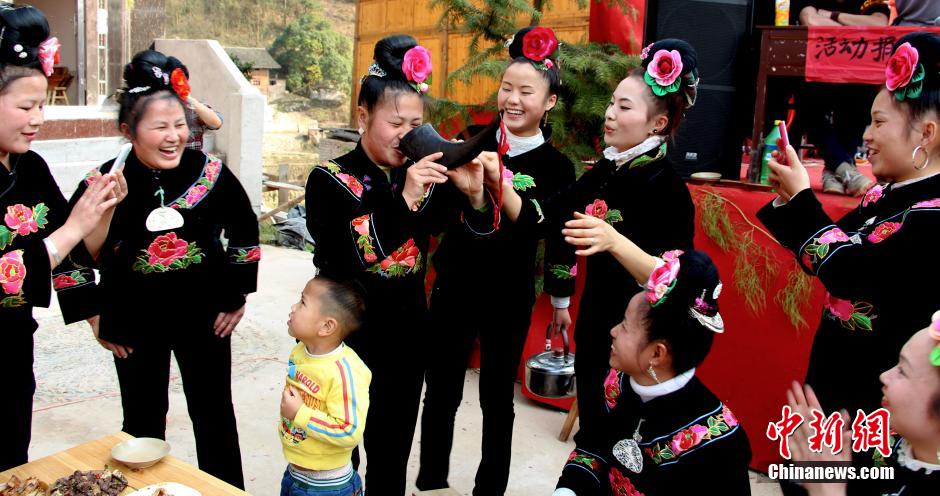 招龙节是贵州省黔东南苗族侗族自治州地区苗族的重要节日,苗族世代相传的古歌《枫木歌》中说,最早这个世界上有着12头水龙,12条旱龙,12条水龙是由水牛来主管,而旱龙由人来主管。苗家人招龙旨在祈求五谷丰登。3月14日至29日是贵州雷山县龙塘苗寨“招龙节”。图为3月19日,回娘家的苗女互相斗酒。中新社发 李雪 摄