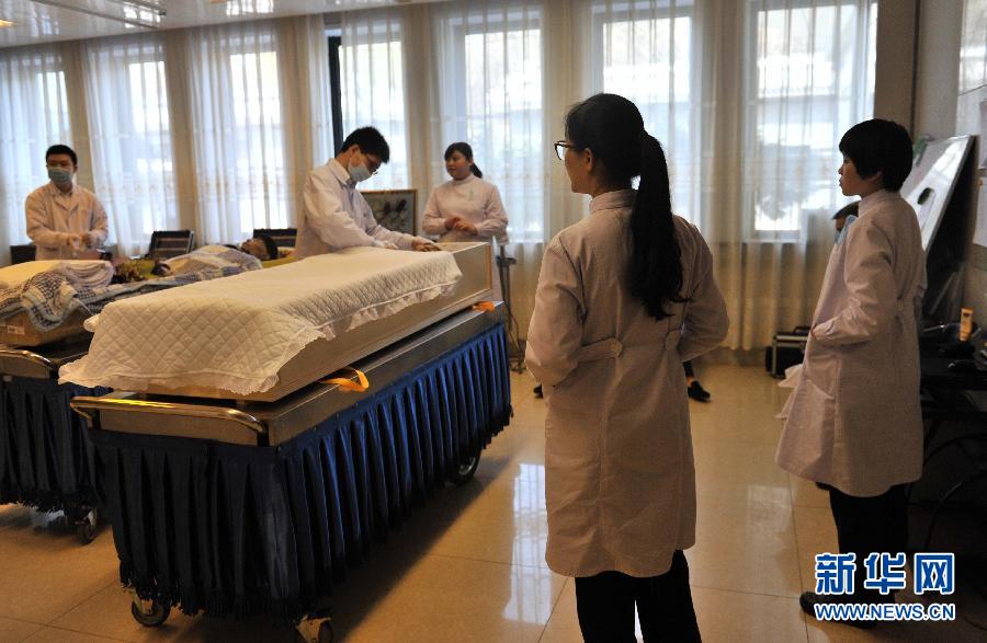 北京八宝山殡仪馆有遗体整容师9名,其中3名女性,杨薇薇、曲杰和赵荻,她们都是25岁。如果逝者是女性,家属往往要求由女性整容师服务。2012年底,北京八宝山殡仪馆成立了“青清女子工作室”,成员便是她们3位。与逝者打交道,总要迈过心理的一道坎。刚参加工作的时候,不仅每天面对尸体,耳边还充斥着号啕大哭声,用她们的话说,“心理就要崩溃了”。但时间长了,渐渐体会到自己工作的意义,也让她们比同龄人有了更多的感悟。她们说,要尽自己最大的努力让逝者体面尊严地离开,至少让家属见最后一面的时候,不至于因面容问题而更加伤感。新华社记者 李文摄