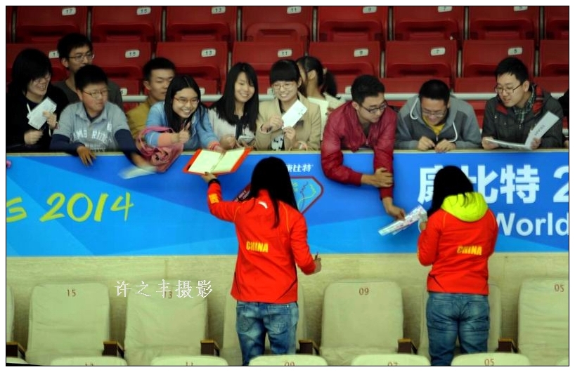 比赛间歇中国女子冰壶队为现场球迷签名留念。工人日报-中工网记者许之丰摄影报道