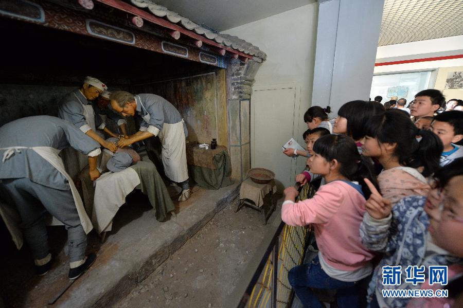 4月4日,小学生们在白求恩大夫医治伤员的模型前参观。新华社记者 朱旭东摄