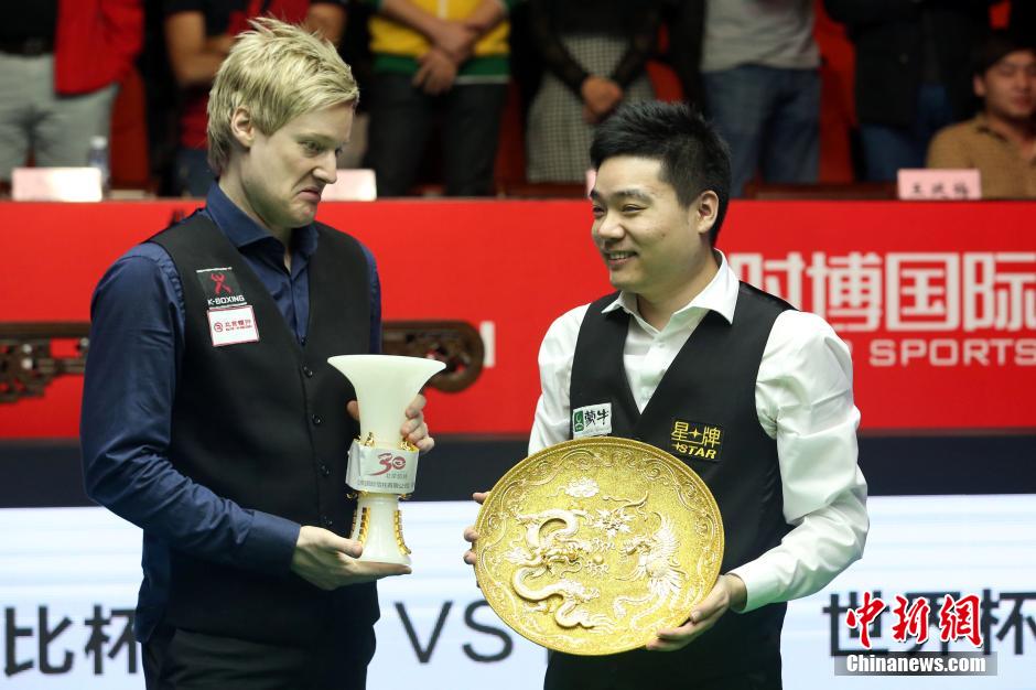 4月6日,丁俊晖与罗宾逊合影。当日,在2014年斯诺克中国公开赛决赛中,中国选手丁俊晖以10比5战胜澳大利亚选手罗宾逊,夺得冠军。中新社发 韩海丹 摄