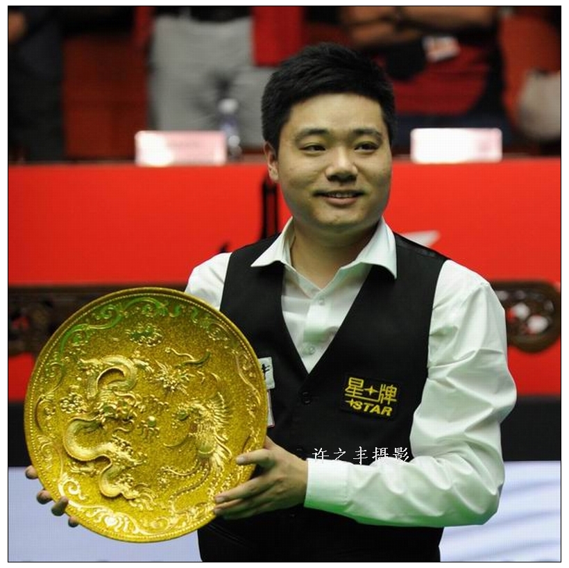2014年4月6日晚,2014年斯诺克中国公开赛在北京大学生体育馆全部结束。决赛第一阶段丁俊晖全面占优,轰1杆破百7比2遥遥领先世界第一罗伯逊。第二阶段丁俊晖再接再厉,再添1杆破百,总比分10比5击败卫冕冠军罗伯逊,时隔9年再次在北京夺冠,收获8万5千英镑冠军奖。这也是丁俊晖单赛季第五次在大型排名赛称雄,追平亨德利的最高纪录,个人排名赛冠军奖杯由此增加到11个。工人日报-中工网记者许之丰摄影报道