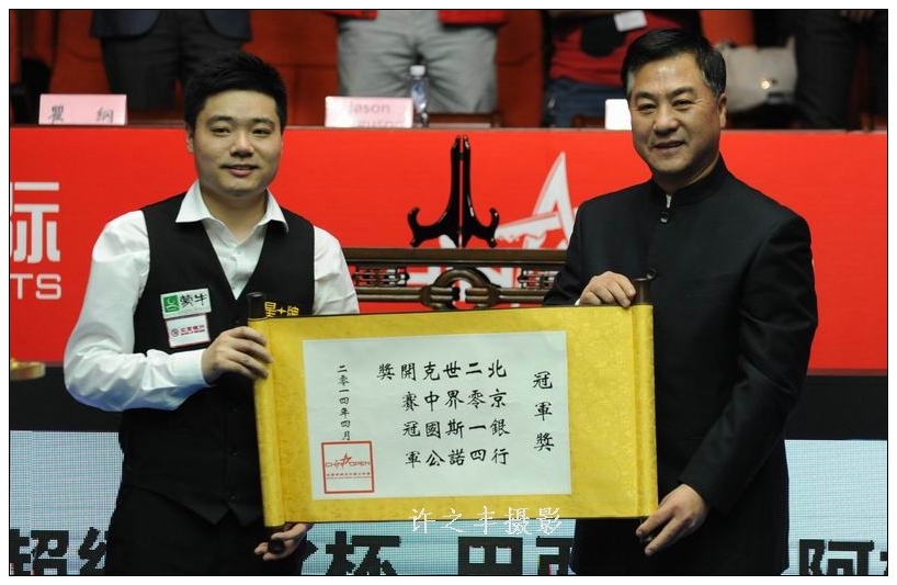 2014年4月6日晚,2014年斯诺克中国公开赛在北京大学生体育馆全部结束。决赛第一阶段丁俊晖全面占优,轰1杆破百7比2遥遥领先世界第一罗伯逊。第二阶段丁俊晖再接再厉,再添1杆破百,总比分10比5击败卫冕冠军罗伯逊,时隔9年再次在北京夺冠,收获8万5千英镑冠军奖。这也是丁俊晖单赛季第五次在大型排名赛称雄,追平亨德利的最高纪录,个人排名赛冠军奖杯由此增加到11个。工人日报-中工网记者许之丰摄影报道