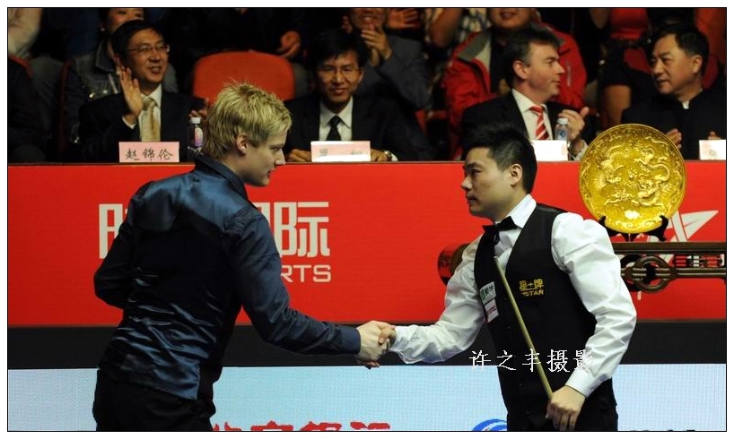 2014年4月6日晚,2014年斯诺克中国公开赛在北京大学生体育馆全部结束。决赛第一阶段丁俊晖全面占优,轰1杆破百7比2遥遥领先世界第一罗伯逊。第二阶段丁俊晖再接再厉,再添1杆破百,总比分10比5击败卫冕冠军罗伯逊,时隔9年再次在北京夺冠,收获8万5千英镑冠军奖。这也是丁俊晖单赛季第五次在大型排名赛称雄,追平亨德利的最高纪录,个人排名赛冠军奖杯由此增加到11个。工人日报-中工网记者许之丰摄影报道