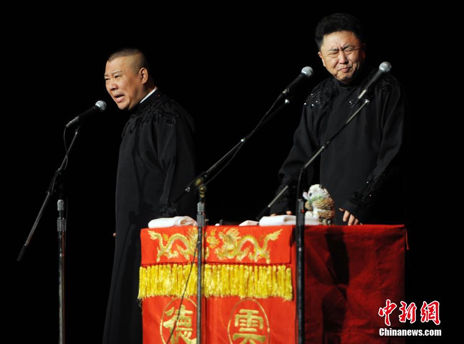当地时间4月19日晚,中国著名相声演员郭德纲、于谦、烧饼、岳云鹏、孙越等人的演出吸引洛杉矶观众。这是继2012年郭德纲与德云社成功举办北美巡演之后,再度发起的旧金山、洛杉矶、纽约和芝加哥的爆笑北美巡演。中新社发 毛建军 摄