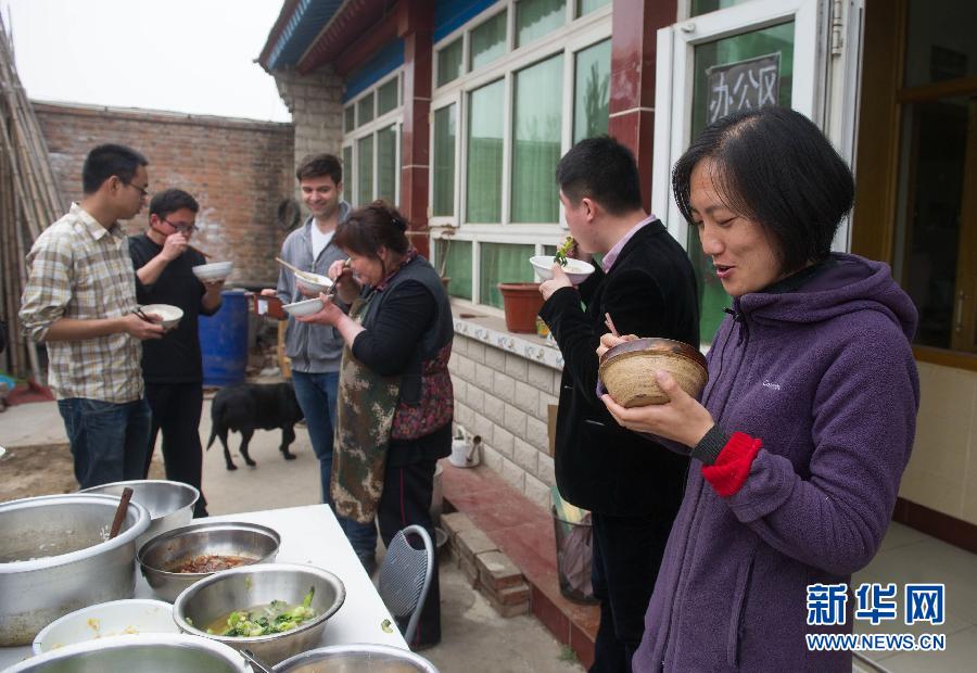 3月28日,石嫣在“分享收获”北京通州基地和员工、志愿者吃午饭。新华社记者 罗晓光摄