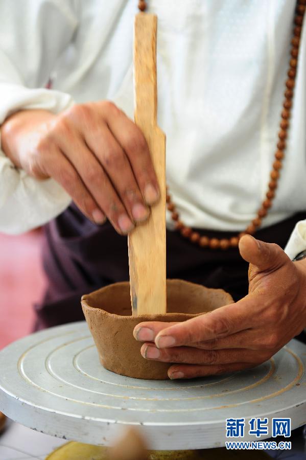 青海省班玛县黑陶艺人谢格太在给学生上黑陶制作基础课(4月18日摄)。新华社发(李少鹏 摄)