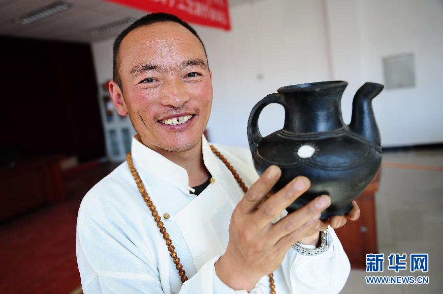 青海省班玛县黑陶艺人谢格太在展示黑陶作品(4月18日摄)。新华社发(李少鹏 摄)