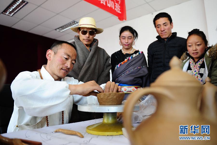 青海省班玛县黑陶艺人谢格太(左一)在教学生制作黑陶(4月18日摄)。新华社发(李少鹏 摄)