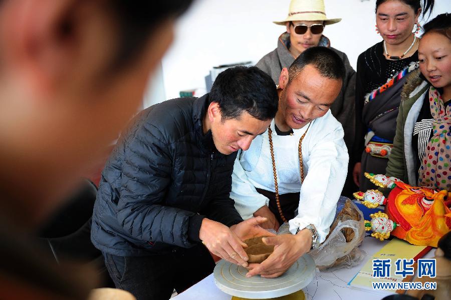 青海省班玛县黑陶艺人谢格太(左二)在指导学生用粘土塑形(4月18日摄)。新华社发(李少鹏 摄)