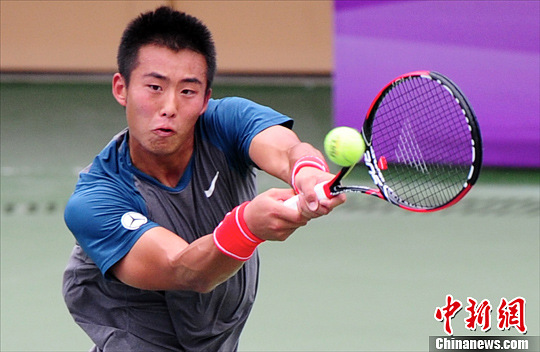 4月23日,中国网球男子名将张择在深圳坪山网球中心金地ATP挑战赛中以6:1、6:3的成绩战胜日本选手内山康孝(Uchiyama Yasutaka )进入下一轮比赛。图为张择在比赛中。中新社发 陈文 摄
