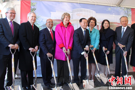 当地时间4月24日,哈佛商学院赵朱木兰中心动土奠基仪式在波士顿举行。 图片右起分别为:中国驻美大使崔天凯、福茂集团副董事长赵安吉、美国前劳工部长赵小兰、福茂集团董事长赵锡成、哈佛大学校长福斯特、哈佛商学院院长诺里亚、美国联邦参议员麦康奈尔、澳大利亚前总理陆克文。李洋 摄