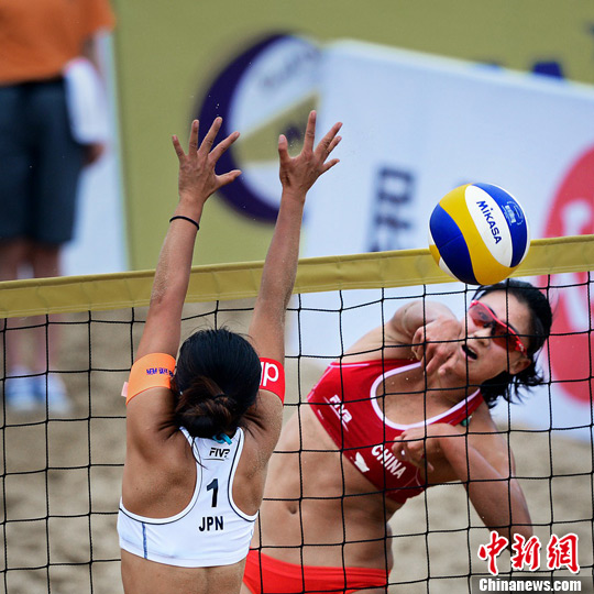 4月24日,2014世界沙排巡回赛在福州举行,福州妹子薛晨大力扣杀赢得福州乡亲的阵阵掌声。张斌 摄
