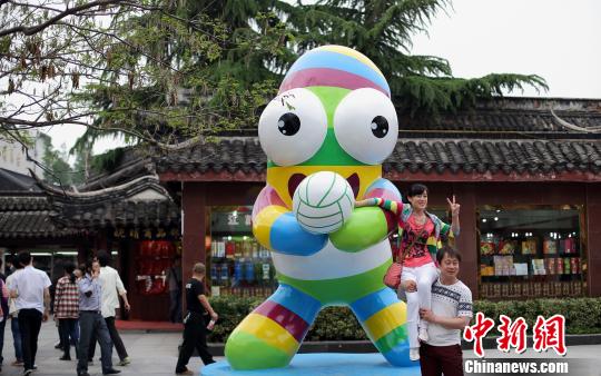 4月24日,游客在南京夫子庙景区内的2014青年奥林匹克运动会吉祥物“砳砳”旁留影。随着2014青奥会举办的日益临近,举办地南京的奥运氛围越来越浓,造型各种的“砳砳”出现在各个场所,各种以“分享青春·共筑未来”为主题的活动相继展开。中新社发 泱波 摄