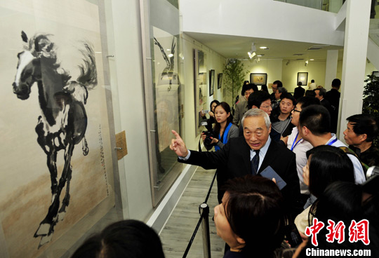 4月26日,由徐悲鸿夫人廖静文女士授权,成都市文化局、成都市文联、北京徐悲鸿纪念馆主办的“神骏踏春又归来——徐悲鸿在四川”绘画精品展在武侯祠美术馆开展。图为成都民众参观展览。中新社发 安源 摄