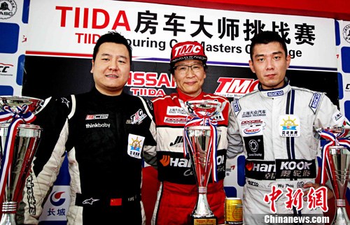 4月27日,2014中国房车锦标赛(CTCC)揭幕战在广东肇庆国际赛车场举行,来自国内的10多支车队近百名车手参加超级量产车组、中国量产车组、TIIDA房车大师挑战赛车组的比赛,日本车手井田雅彦(中)夺得TIIDA房车大师挑战赛第一回合冠军,杨曦、吴洲分获第二、三名。中新社发 赵振清 摄