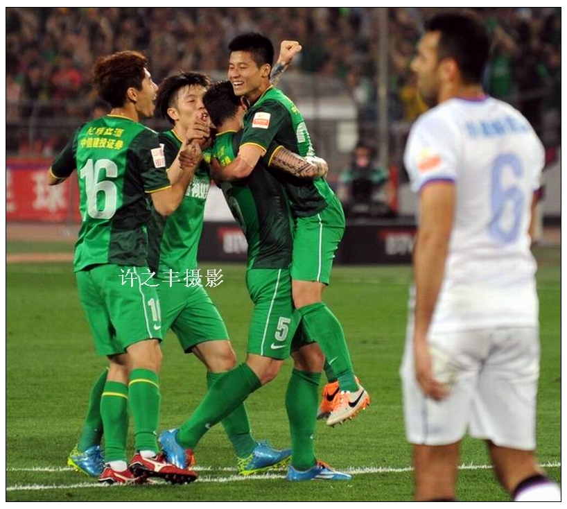 2014年4月30日晚,中超联赛第9轮比赛,北京国安主场1比0击败江苏舜天,比赛进行到第61分钟,乌塔卡中路拿球后分边,张稀哲小角度打门被对方守门员挡出,外围乌塔卡一晃,后点陈志钊起脚打门皮球应声入网,这也是陈志钊连续两轮取得打入制胜球,国安近3个赛季来首次主场击败舜天。图为双方激烈的比赛。工人日报-中工网记者许之丰摄影报道