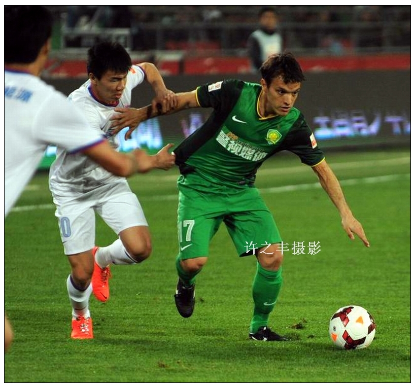 2014年4月30日晚,中超联赛第9轮比赛,北京国安主场1比0击败江苏舜天,比赛进行到第61分钟,乌塔卡中路拿球后分边,张稀哲小角度打门被对方守门员挡出,外围乌塔卡一晃,后点陈志钊起脚打门皮球应声入网,这也是陈志钊连续两轮取得打入制胜球,国安近3个赛季来首次主场击败舜天。图为双方激烈的比赛。工人日报-中工网记者许之丰摄影报道
