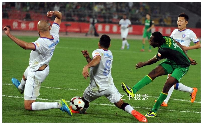 2014年4月30日晚,中超联赛第9轮比赛,北京国安主场1比0击败江苏舜天,比赛进行到第61分钟,乌塔卡中路拿球后分边,张稀哲小角度打门被对方守门员挡出,外围乌塔卡一晃,后点陈志钊起脚打门皮球应声入网,这也是陈志钊连续两轮取得打入制胜球,国安近3个赛季来首次主场击败舜天。图为双方激烈的比赛。工人日报-中工网记者许之丰摄影报道