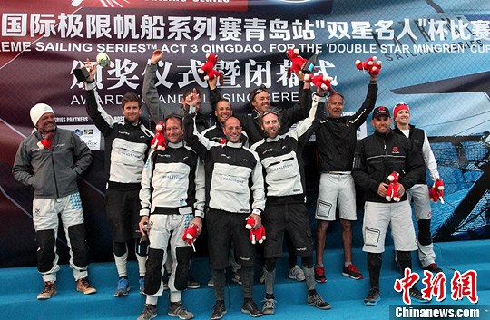 5月4日下午,2014国际极限帆船系列赛青岛站比赛在青岛奥林匹克帆船中心收帆。瑞士阿灵基队和锐挺队包揽本站冠、亚军,新西兰酋长队获第三名。青岛站结束后,将于6月在俄罗斯圣彼得堡进行第四站的比赛。中新社发 徐崇德 摄