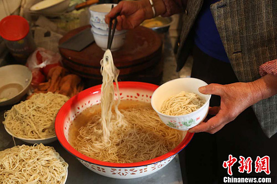 5月6日是农历四月初八,是甘肃农村的一个节日,夜晚有吃“长面”的习俗。当日,中新网记者在甘肃白银市走基层,发现当地的“水川长面”和兰州的牛肉面相媲美,面条长长的细细的,煮熟后先要在凉水里浸泡片刻,再捞到碗里,浇上以大肉臊子为主的汤,这种汤有绿菜,还有酱、醋调色,再调上油泼辣子,可媲美兰州牛肉面。