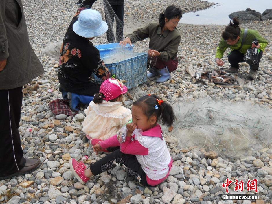在朝鲜咸镜北道七宝山脚下的宝村里民俗村,是朝鲜对外国游客开放程度最高的村庄。5月上旬,记者跟随从吉林省图们市出发的一个旅行团来到这里。村庄占地7公顷,有20户朝鲜居民。村庄离大海非常近,村民大多从事渔业。 图为民俗村外海滩上,正在捡拾渔网上海鱼的村民。中新社发 陈博宜 摄