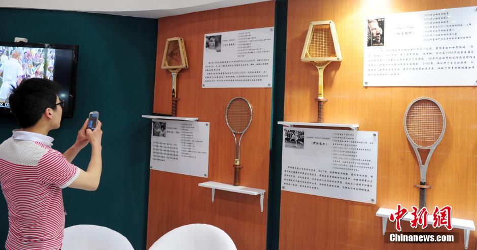 5月9日,30余把不同时期的冠军古董网球拍吸引众多参观者。当日,中国国际体博会在湖北武汉开幕,博览会特别设置网球运动史与古董网球拍展示。时间跨度从1905年至1985年的古董网球拍、选手故事、明星签名穿起来网球发展史的时间走廊,带领观众领略网球运动的发展历程。中新社发 张畅 摄