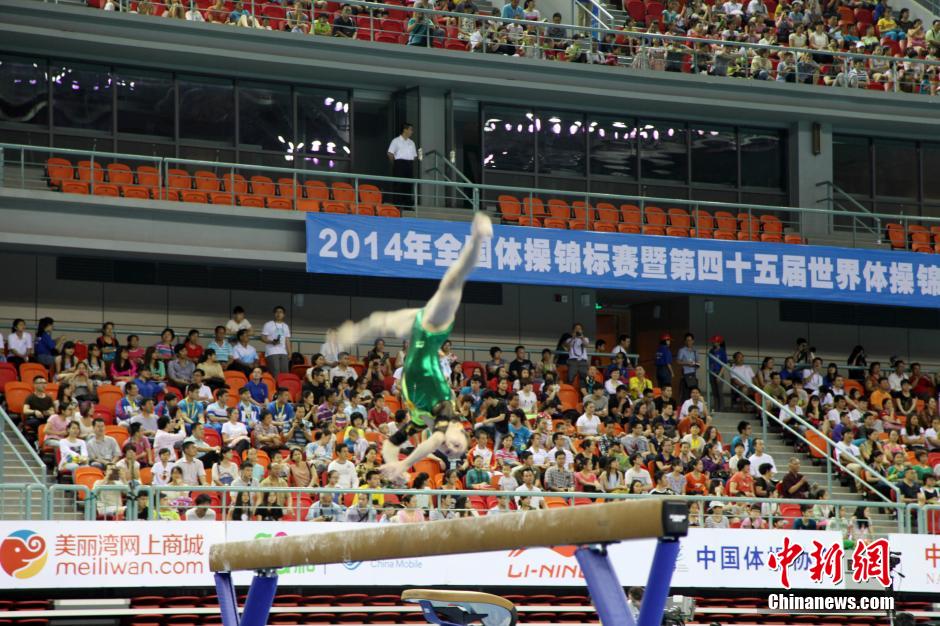 5月10日,2014年全国体操锦标赛暨第四十五届世界体操锦标赛测试赛进入第二个比赛日。浙江队以218.75分摘取女子团体桂冠,广东队、湖南队分别位列二、三名。中国国家体育总局体操运动管理中心副主任黄玉斌、南宁市市长周红波、“体操王子”李宁当晚为获奖代表队颁奖。图为比赛现场。中新社发 杨志雄 摄