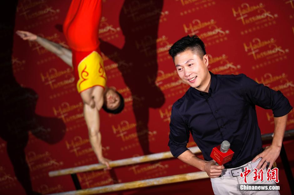 6月10日,“体操王子”李小鹏携爱女奥莉及爱妻在北京杜莎夫人蜡像馆揭幕蜡像。近期参与的浙江卫视的亲子类节目《爸爸回来了》中,头顶着16个冠军头衔的体操王子首次带着自己的爱女出镜,成功跨界娱乐圈,凭借其颇高的人气和严父形象,获封“最靠谱奶爸”,女儿更是被冠以“国民萌娃”称号。中新社发 杨阳 摄