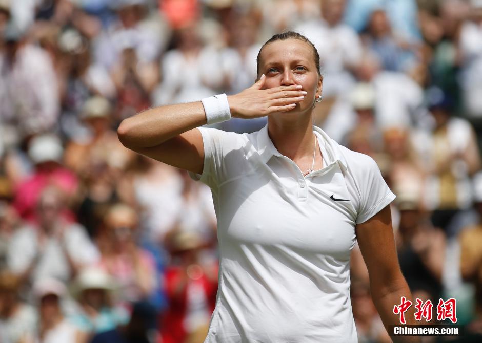 当地时间7月3日,在英国伦敦举行的2014年温布尔登网球锦标赛进入正赛第10日。在女单半决赛的首场比赛中,6号种子、前赛会冠军科维托娃历经抢七,直落两盘7(8)-6(6)/6-1击败了同胞萨法洛娃,时隔三年后再次进入到最终的决赛。中新社发 杜洋 摄