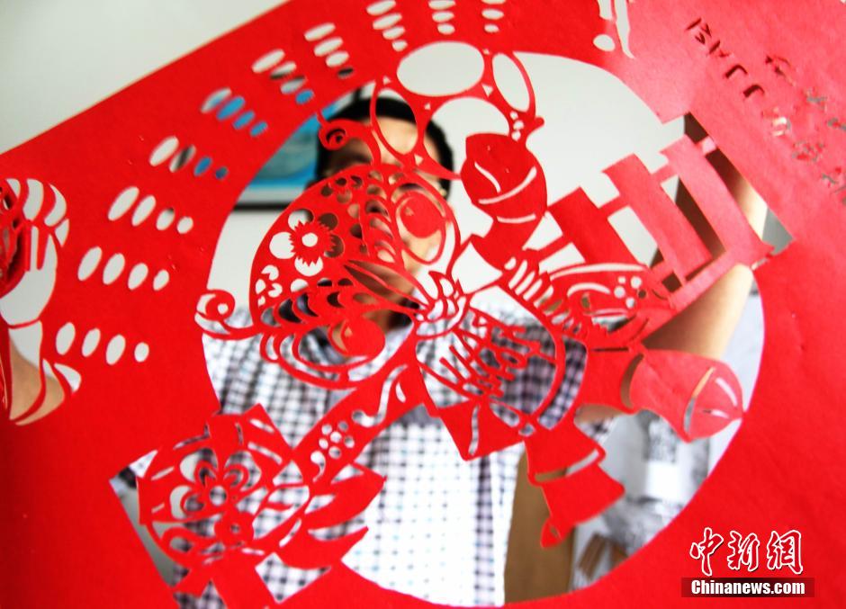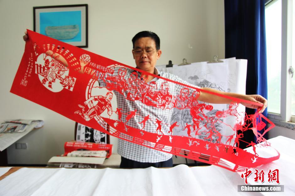 7月6日,江西省级非物质文化遗产传承人、瑞昌市民间剪纸艺人朱朴光完成了他的剪纸“世界杯”作品。这幅长1.5米、宽30厘米的剪纸作品,将世界各大强队的著名球员肖像,以剪纸的形式表现出来,共计剪出了30个各具特征、活灵活现的人物,同时还剪出了世界杯吉祥物。据朱朴光介绍,创作这幅作品,他整整花了一个星期。魏东升 摄