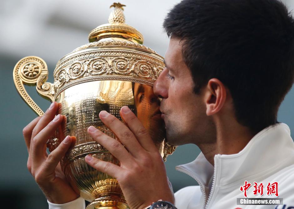 当地时间7月6日,在英国伦敦举行的2014年温布尔登网球公开赛男单决赛中,头号种子德约科维奇以6-7(7)/6-4/7-6(4)/5-7/6-4战胜了七届赛会冠军费德勒,斩获了生涯第七个大满贯冠军,同时也是第二个温网冠军。依靠这个冠军,德约科维奇也超越了纳达尔,重登世界第一的宝座。中新社发 杜洋 摄