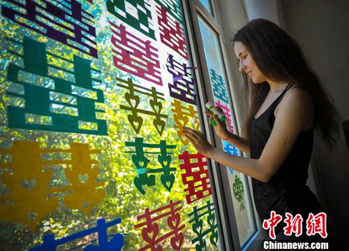 7月9日,哈萨克斯坦阿拉木图市国际哈中语言学院,18岁的阿丽娜正将教室窗户上脱落的剪纸作品“囍”重新贴在窗户上。阿丽娜即将前往中国继续深造,假期来学校主要是为了找校方帮助办理签证事宜。据介绍,国际哈中语言学院是一所以汉语、英语教学为主的语言学校,目前已培养1000多名学生,部分学生毕业后选择前往中国继续深造。中新社发 刘新 摄