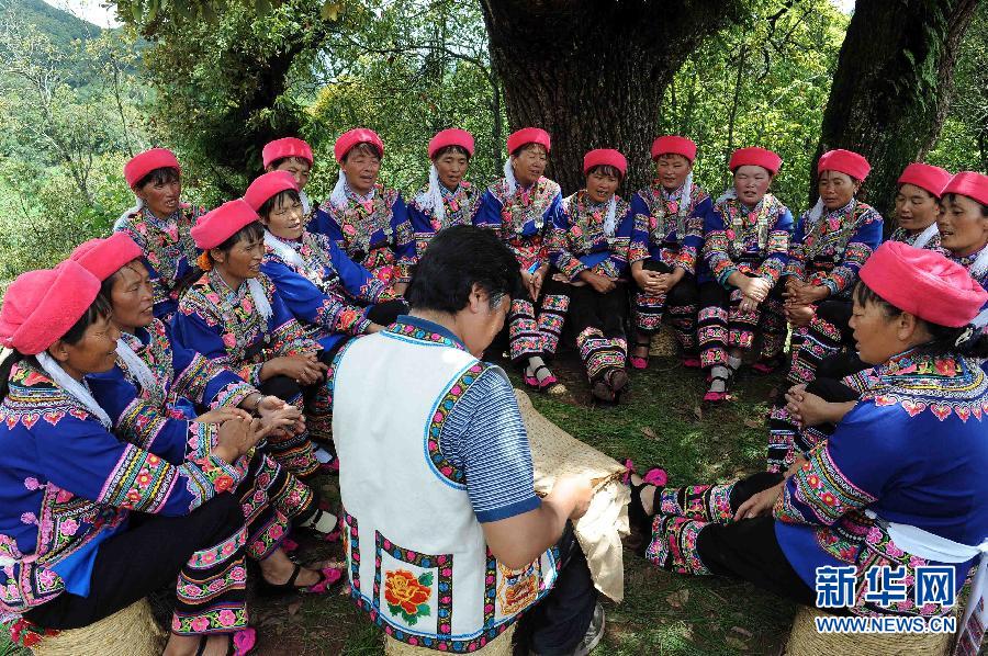 7月24日,云南省楚雄彝族自治州双柏县李方村的彝族群众聚在树荫下唱彝族民谣。