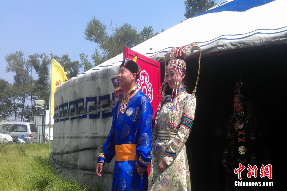 8月1日,来自北京、天津、浙江等地的24对新人在内蒙古呼和浩特市举行蒙古族集体婚礼,体验蒙古族习俗和文化。中新社发 尚虹波 摄