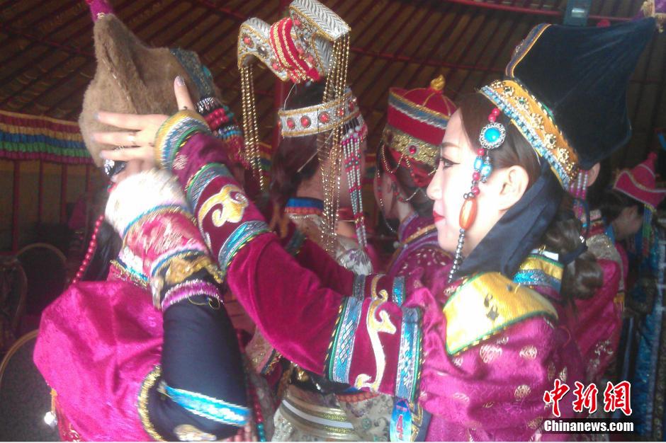8月1日,来自北京、天津、浙江等地的24对新人在内蒙古呼和浩特市举行蒙古族集体婚礼,体验蒙古族习俗和文化。中新社发 尚虹波 摄