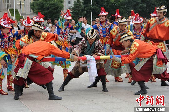 图为“裕固族顶杠子”,裕固族叫“木尔格”。每逢喜庆节日和重大民族盛会,裕固族人民都要进行“顶杠子”比赛。演员们摆好阵势,在裕固族民歌的伴奏下,由两位汉子将一根木杠子抬起并互顶在腹部,开始顶杠子。之后,姑娘们手持彩带向胜者祝福。栗萌 摄