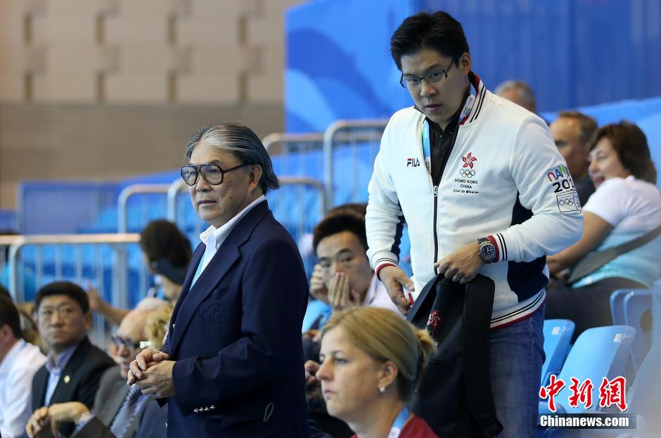 8月19日,霍震霆霍启刚父子观战青奥会男子花剑男子个人决赛,为香港队选手蔡俊彥加油。当日,在南京国际博览中心击剑馆举行的第二届夏季青年奥林匹克运动会男子花剑个人决赛中,中国香港选手蔡俊彥不敌波兰选手安杰伊·扎德科夫斯基,以13比15惜败,获得亚军。中新社发 泱波 摄