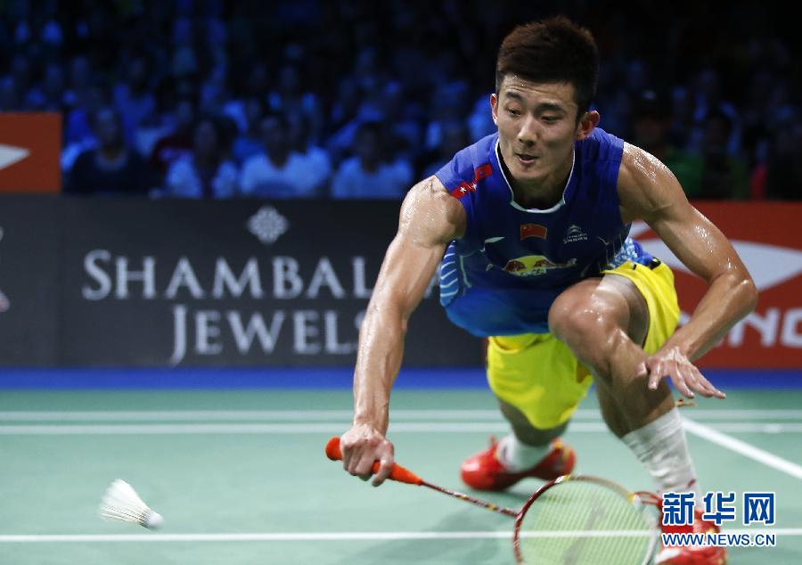 8月31日,中国选手谌龙在决赛中。当日,在丹麦哥本哈根巴勒鲁普超级体育馆举行的2014年世界羽毛球锦标赛男子单打决赛中,中国选手谌龙以2比0战胜马来西亚选手李宗伟,夺得冠军。新华社记者王丽莉摄。