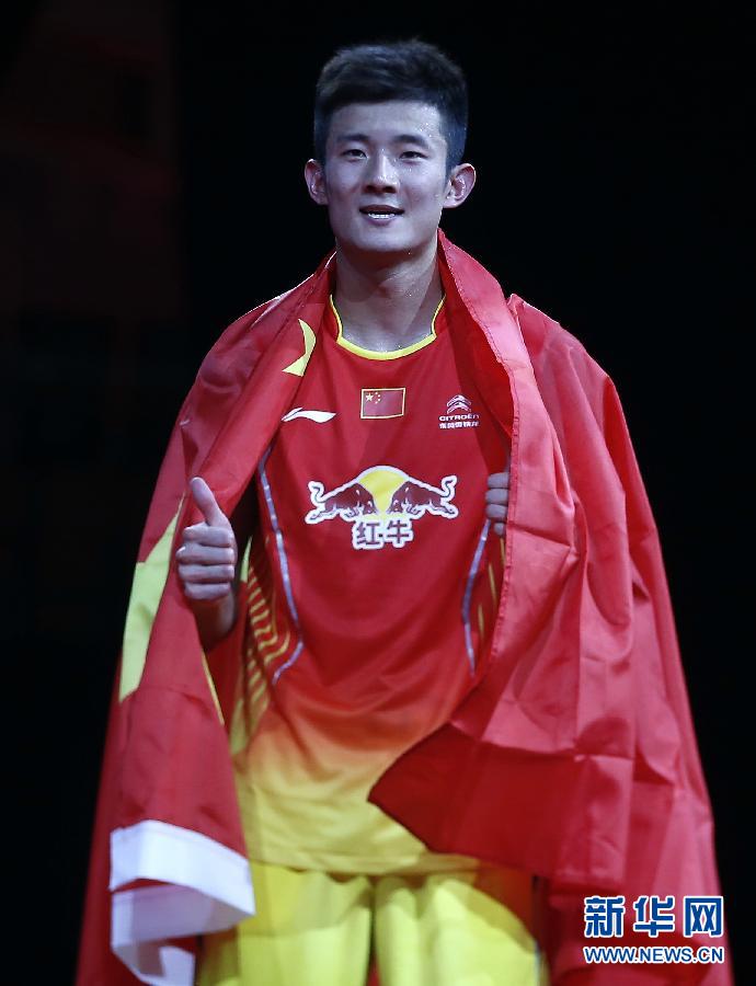 8月31日,中国选手谌龙在颁奖仪式上庆祝。当日,在丹麦哥本哈根巴勒鲁普超级体育馆举行的2014年世界羽毛球锦标赛男子单打决赛中,中国选手谌龙以2比0战胜马来西亚选手李宗伟,夺得冠军。新华社记者王丽莉摄